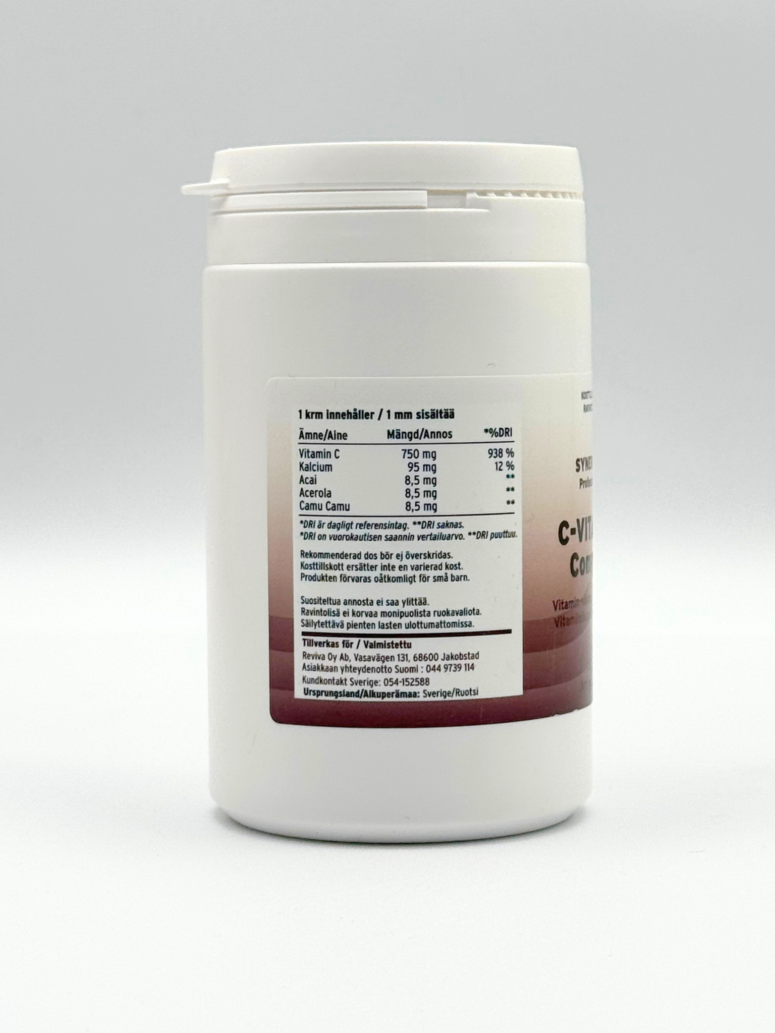 242,5 gram kalciumaskorbat. 2,5 g Acaipulver. 2,5 g Acerolaextrakt. 2,5 g Camu Camu extrakt.